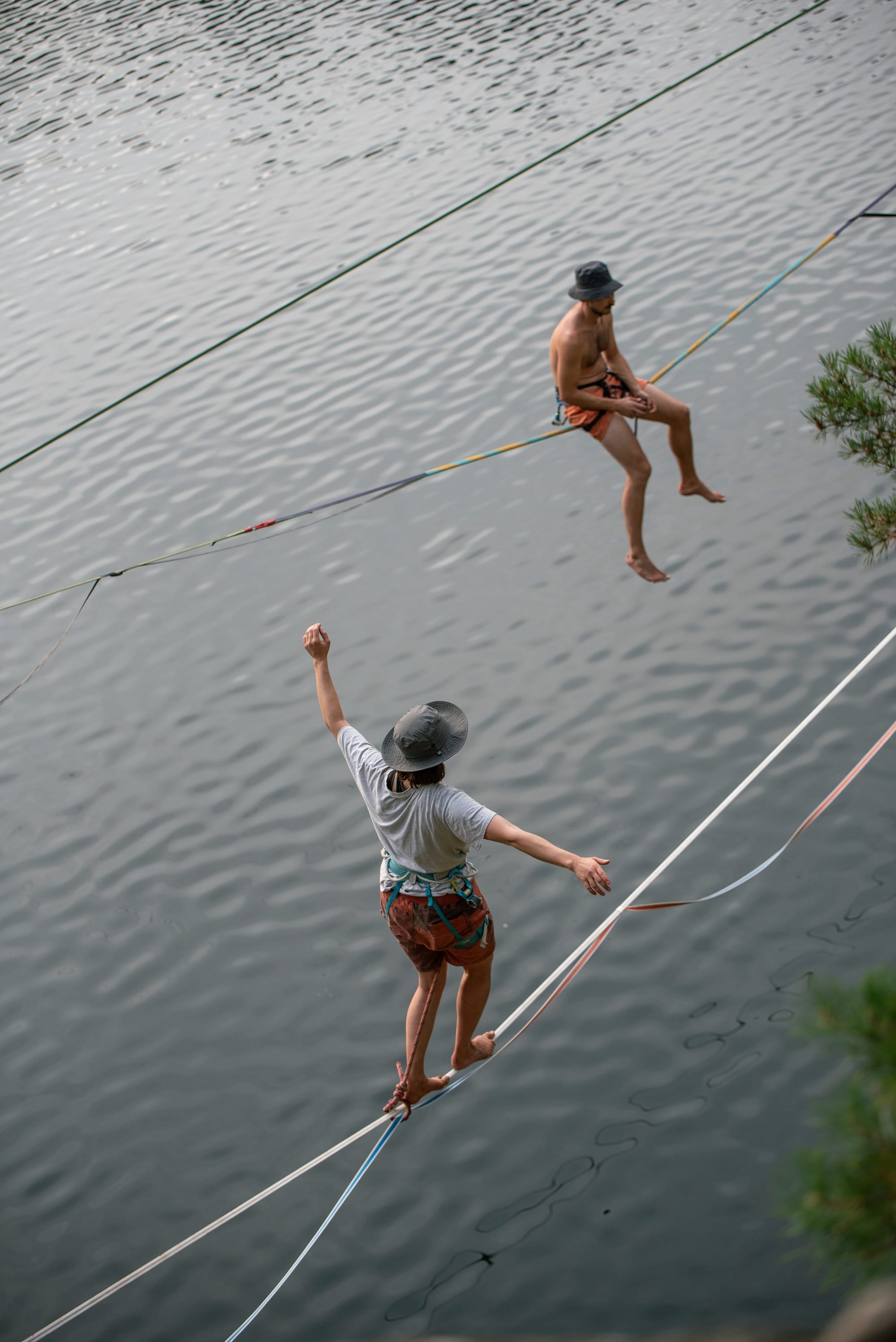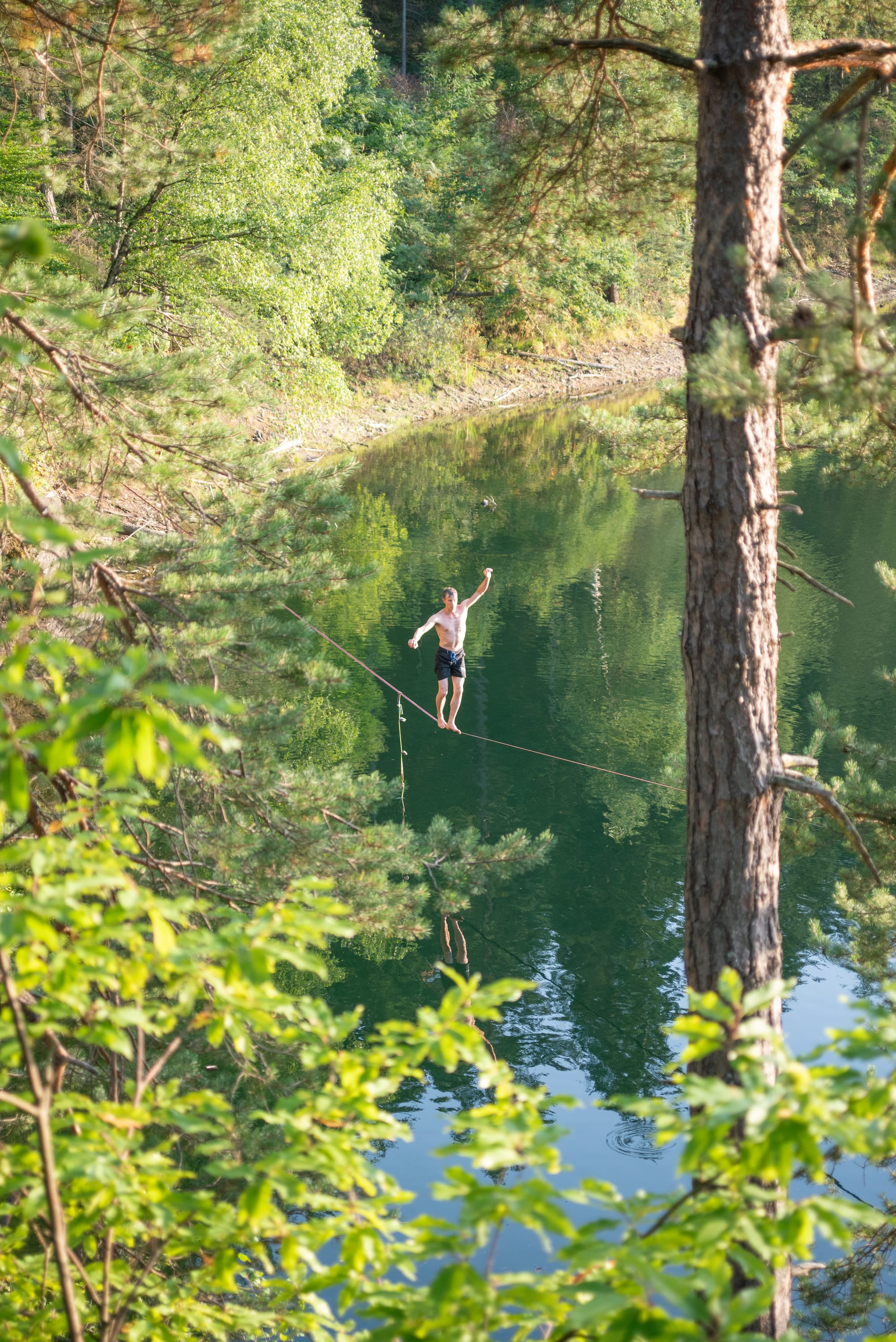 Der Highline-Beginner-Workshop wird gut besucht und erste Aufroll- und Aufstehversuche und ein paar Schritte sind zu sehen. Wir lernen etwas über Baumklettertechnik. Anscheinend mag die Gegend um den Stausee keine illegalen Flugobjekte denn am Samstag stürzen nicht nur eine, sondern gleich zwei Drohnen ab. Leider kann nur eine davon wiederbelebt werden, an der Auferstehung der anderen Drohne wird nach wie vor gearbeitet. Generell will das Drohnenfliegen gelernt sein um Beinahecrashes mit Highlines zu vermeiden und geplante Werbespots nicht nur zu fliegen, sondern auch zu filmen :D. Besonders schön ist das hin und wieder durchziehende Gewitter, da wir erstens den Not-Derig der 550er üben können und zweitens alle trocken unter der Jurte sitzen. Sonntag bekommt den Preis für das beste Essen in größter Menge (Linsen-Daal).