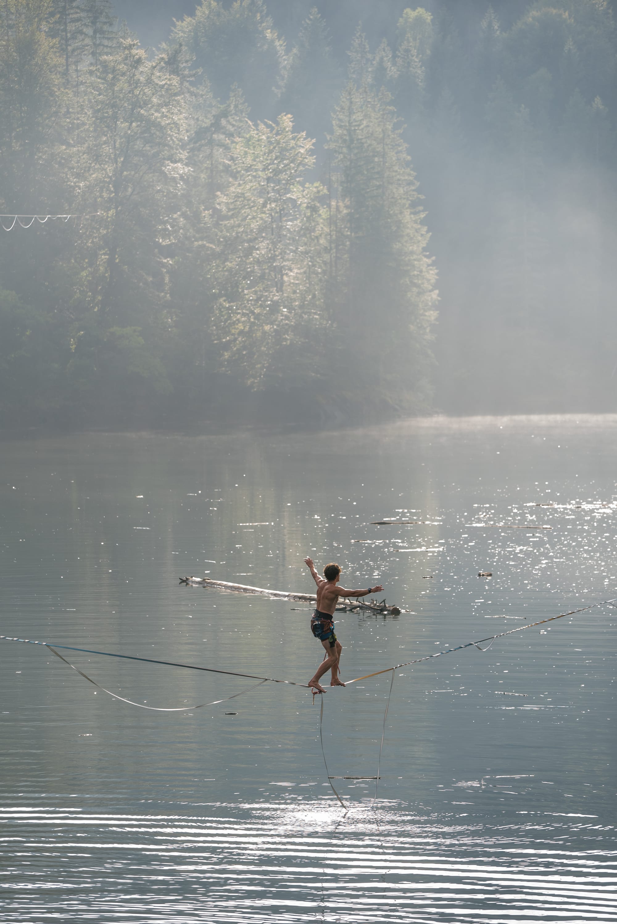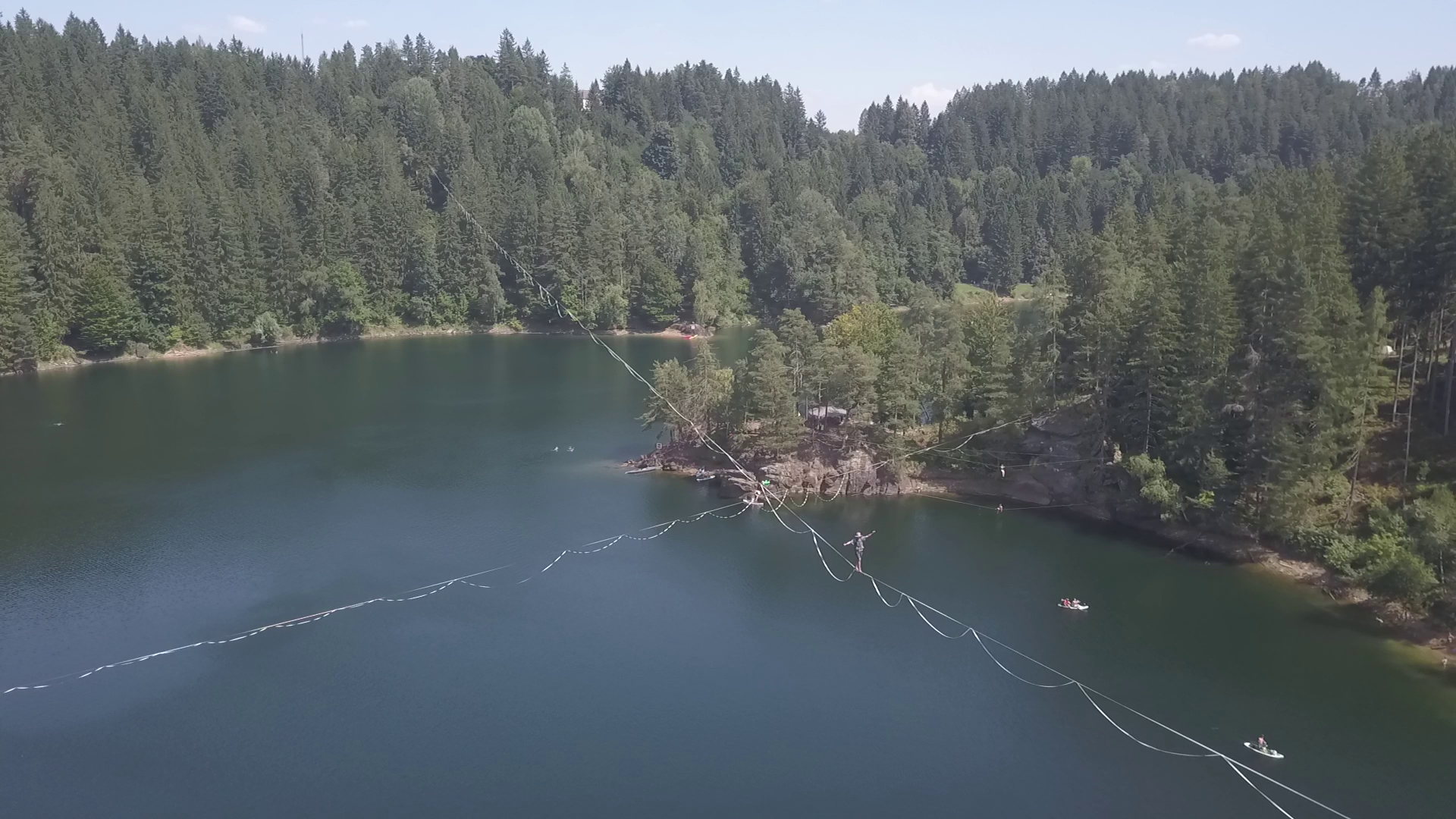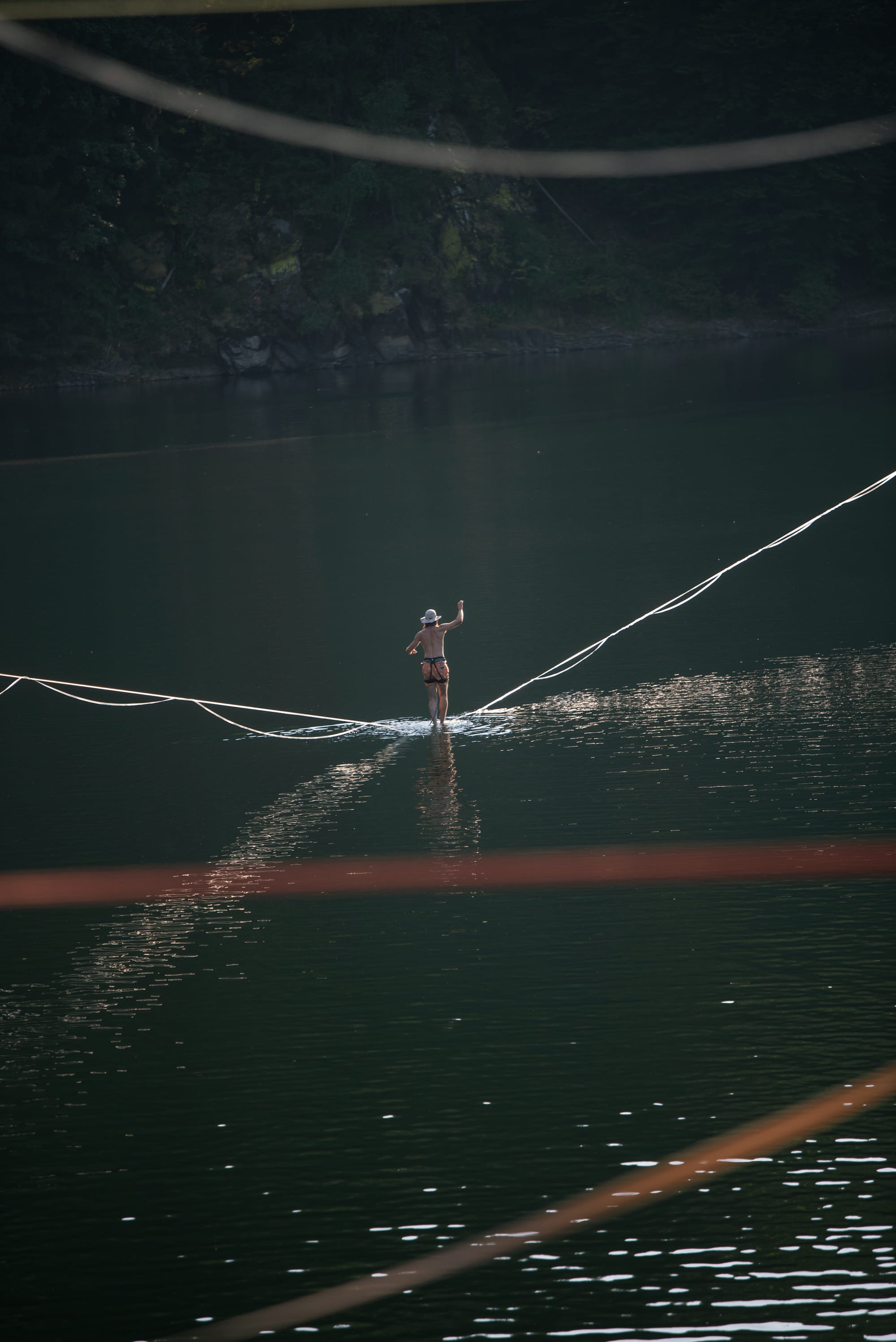 Montag: Um Zeit zu sparen, bauen wir Montagabend schon die 150er und die 300er ab. Der Stausee nimmt Rache, die 300er geht trotz Dyneema (???) unter und bleibt hängen. Große Panik. Irgendwie schaffen wir es, mit Boot und SUP die Line so über den See zu paddeln, dass sich die Verhängung unter Wasser löst. Ein voll mit Slackline beladenes Boot ist das Resultat.